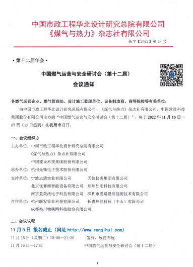 【附發(fā)言主題、發(fā)言人】中國燃氣運營與安全研討會(第十二屆)會議通知:由中國市政工程華北設(shè)計研究總院有限公司、《煤氣與熱力》雜志社有限公司、中國建設(shè)科技集團股份有限公司主辦的“中國燃氣運營與安全研討會(第十二屆)”,將于2022年11月15日—17日(15日簽到)在杭州市召開。