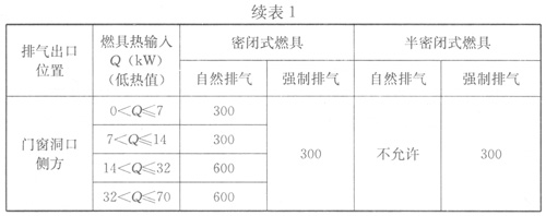 2我國住宅多數(shù)為多層或高層,多數(shù)燃具煙管高位安裝在本層門窗洞口上方,即安裝在上層住宅門窗洞口的下面了,故對上一層住宅的門窗洞口會有煙氣進入的問題產(chǎn)生。對居住房間(臥室和起居室)參照英、美標準進行了嚴格的安全間距規(guī)定(1.2~1.5)m,這與英、美單層住宅不同。