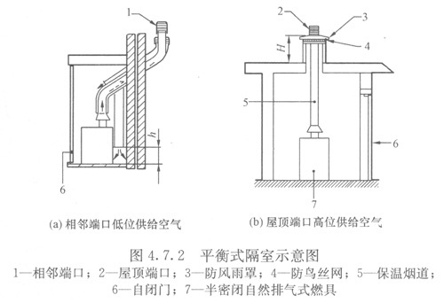 4.7.1當(dāng)半密閉自然排氣式燃具安裝部位臨近較高建筑或用氣建筑較高造成煙道過長無法安裝時(shí),或用戶需要的燃具熱負(fù)荷大于35kW時(shí),可設(shè)置平衡式隔室,并將半密閉自然排氣式燃具安裝在平衡式隔室內(nèi)。