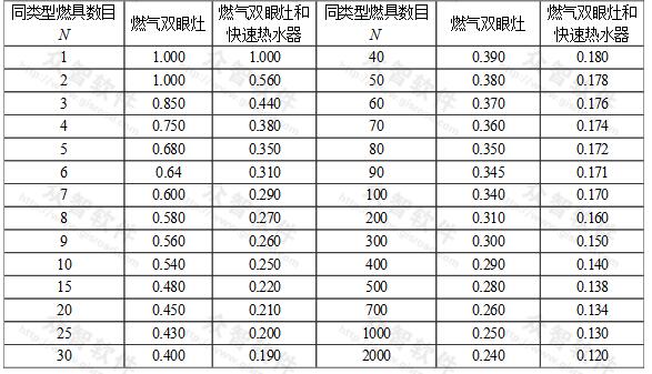 注:1 表中“燃氣雙眼灶”是指一戶居民裝設一個雙眼灶的同時工作系數(shù);當每一戶居民裝設兩個單眼灶時,也可參照本表計算。