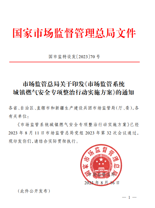 市場監(jiān)管總局關(guān)于印發(fā)《市場監(jiān)管系統(tǒng)城鎮(zhèn)燃?xì)獍踩珜m?xiàng)整治行動(dòng)實(shí)施方案》(國市監(jiān)特設(shè)發(fā)〔2023〕70號(hào))