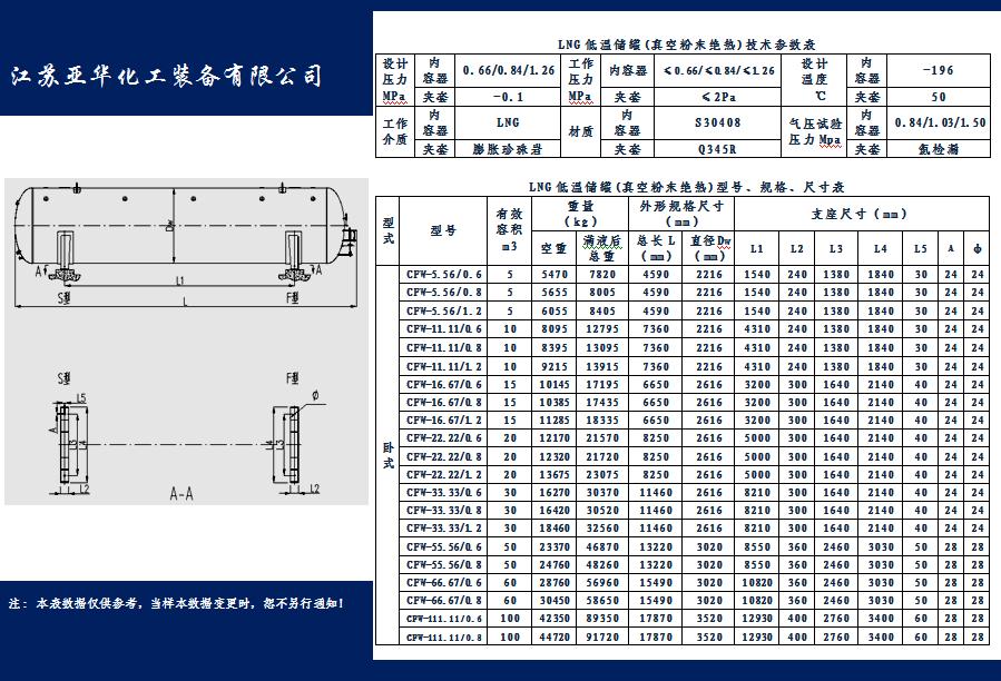 亞華臥式LNG低溫儲(chǔ)罐(真空粉末絕熱)技術(shù)參數(shù)表
