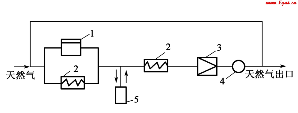 如果長距離輸氣管線的壓力大于儲氣庫的壓力,必要時使天然氣通過預(yù)熱器再進(jìn)入儲氣庫,以防止在壓力突然降低時生成水合物。如果儲氣庫的壓力大于或等于管線壓力,則必須使天然氣經(jīng)壓縮機(jī)加壓,達(dá)到需要的壓力后送入儲氣庫,而儲氣庫則靠自身的壓力將天然氣輸出。輸出的天然氣在進(jìn)調(diào)壓器前也需經(jīng)過預(yù)熱器。此外,在儲氣庫工作的第一年,還需要將含水的天然氣進(jìn)行干燥處理。