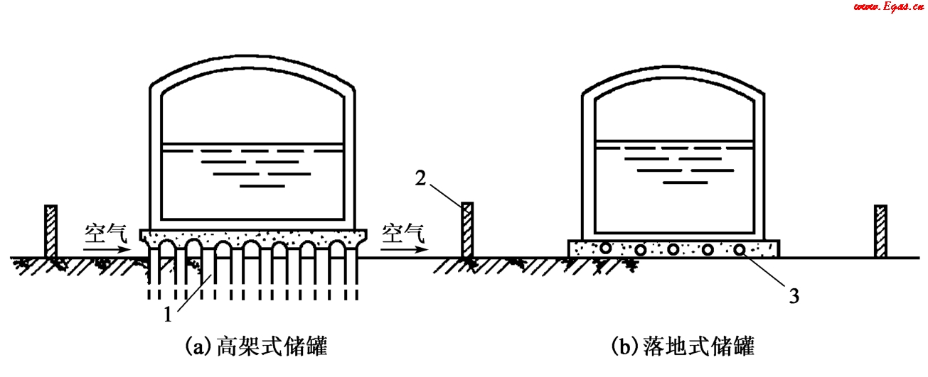 ②高架式儲罐是用立柱支撐罐體底盤,使其與地面分開,保持儲罐與地面之間空氣暢通,防止液化石油氣或液化天然氣吸收地面熱量,以避免土壤凍結(jié)。