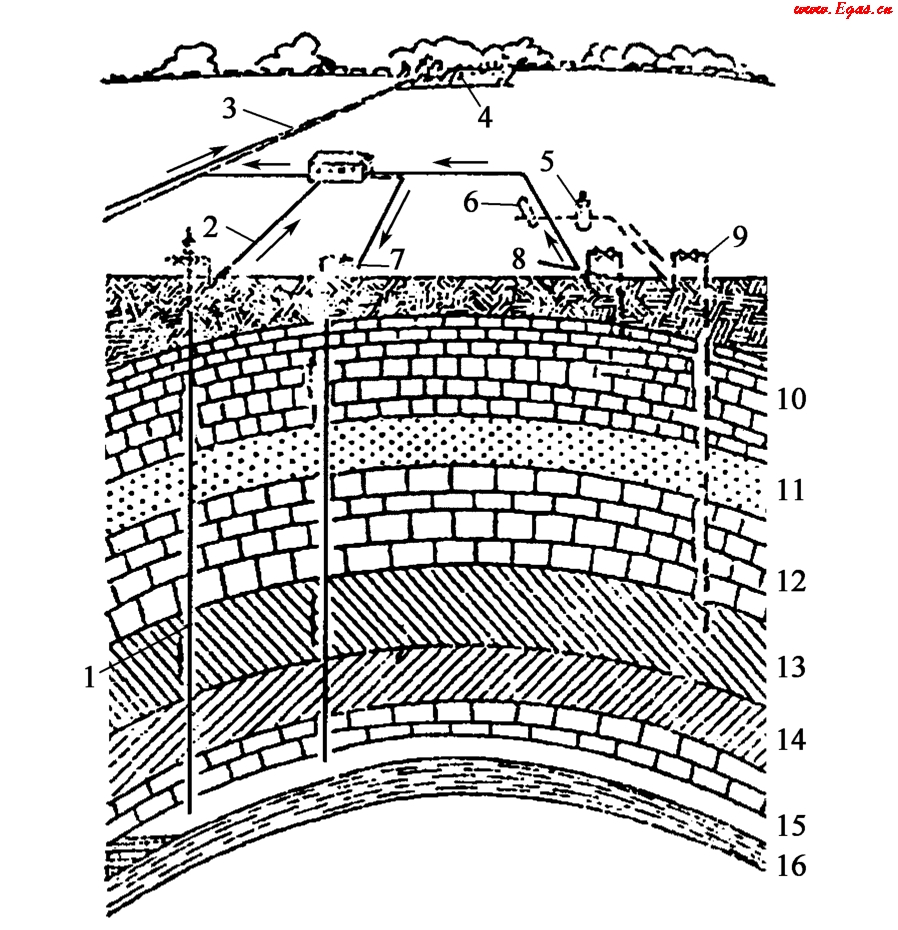1—從儲氣層中取氣的氣井;2—供氣管線;3—輸氣干線;4—壓氣站;5—注水泵;6—水源;7—向儲氣層注氣的注氣井;8—收集泄漏氣的氣井;9—注水井;10—石灰?guī)r;11—砂巖;12—石灰?guī)r;13,14,16—黏土層;15—多孔砂層
