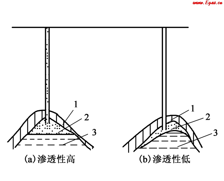 如果儲氣庫滲透性很好,天然氣擴(kuò)散時水位呈平面形;如滲透性很低,則天然氣擴(kuò)散時使水位形成一個弧形,如圖6-9所示。對于滲透性高的儲氣庫,在排氣時水能夠很快壓回,還可回收一部分用于注氣的能量。