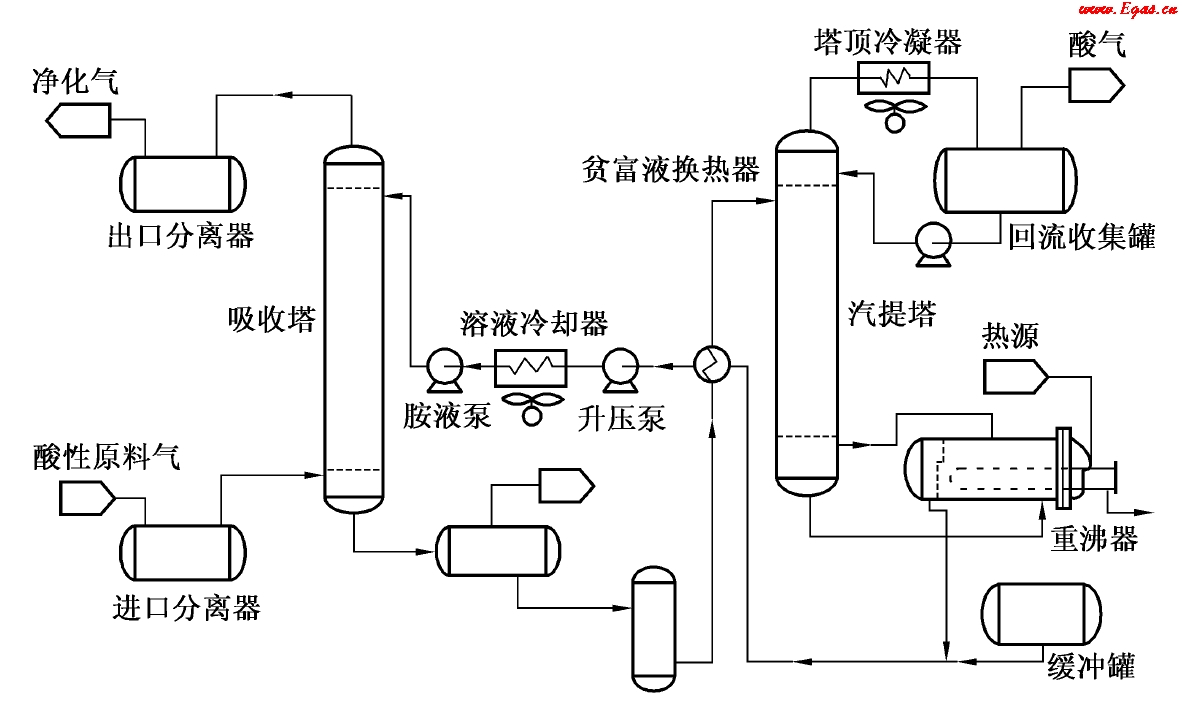 原料氣通過分離器除去游離的液體及夾帶的固體雜質后進入吸收塔,在塔內(nèi)自下而上地和醇胺溶液逆流接觸而脫除酸氣組分,出吸收塔的凈化氣經(jīng)分離器而排出裝置。吸收塔底排出的富液經(jīng)貧/富液換熱器與貧液傳熱而升溫,然后進入汽提塔上部。在高壓下操作的裝置通常富液先經(jīng)過閃蒸罐,盡可能閃蒸出溶解于脫硫溶液中的烴類后再汽提再生,以避免損失原料氣和影響再生質量。汽提塔底部排出的貧液經(jīng)換熱器冷卻后,返回吸收塔上部。