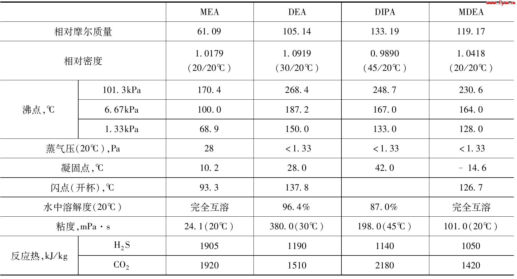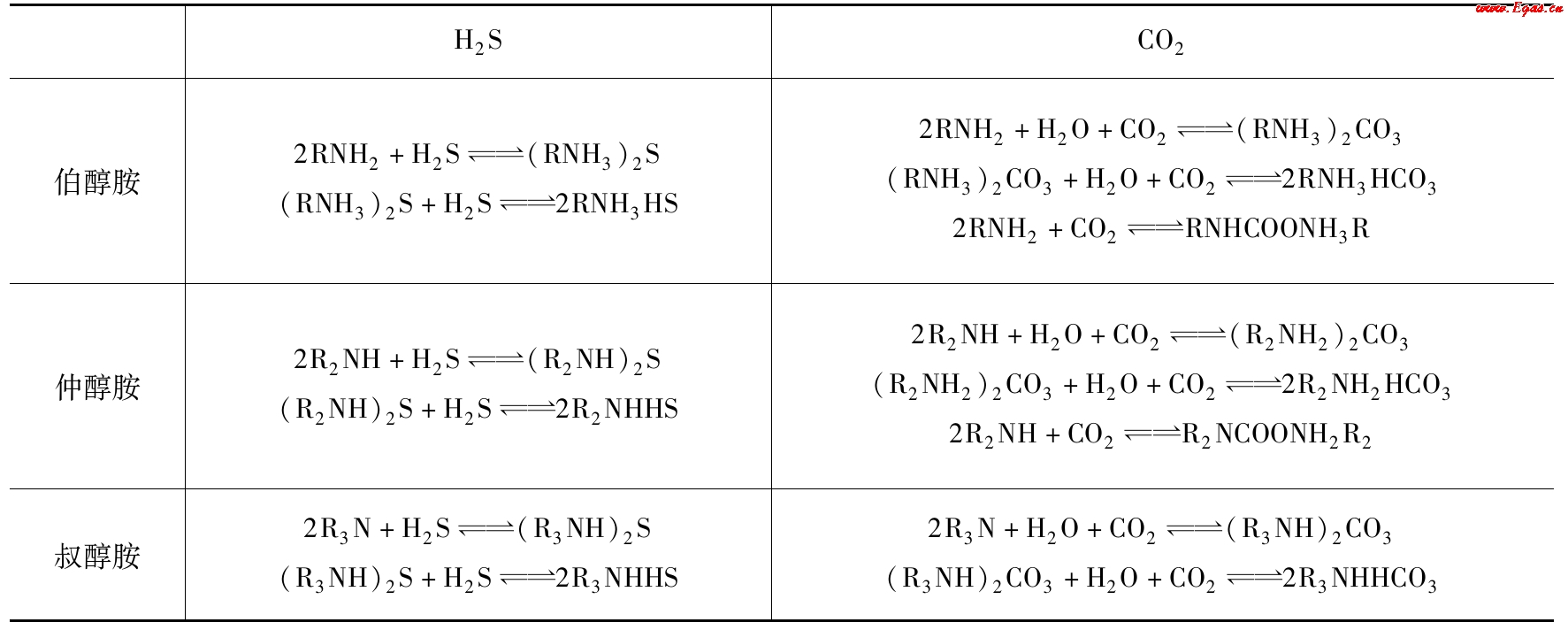 表2-3可見,醇胺與H2S、CO2的主要反應均為可逆反應。在吸收塔中上述反應的平衡向右移動,天然氣中的酸氣組分被脫除;在汽提塔中則平衡向左移動,醇胺溶劑釋放出酸氣組分而再生。