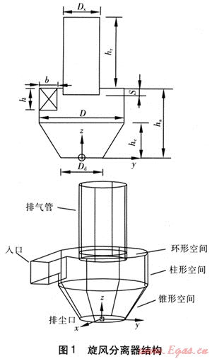 旋風(fēng)分離器的分離效率和分離器內(nèi)的流場是密切相關(guān)的,深入研究分離器內(nèi)的氣固兩相流動特性對于其結(jié)構(gòu)優(yōu)化、提高分離效率有重要意義。近年來,國內(nèi)外在旋風(fēng)分離器結(jié)構(gòu)尺寸、入口流速等對分離效率的影響已經(jīng)做了大量研究和討論,但是對旋風(fēng)分離器入口截面高寬比對分離器分離效率影響的研究還不多。本文對入口截面高寬比對旋風(fēng)分離器內(nèi)流場的影響進(jìn)行探討。