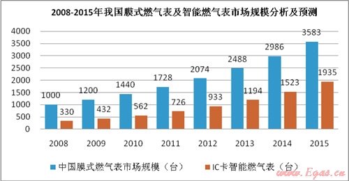 根據(jù)中國計量協(xié)會的相關(guān)數(shù)據(jù),我國目前約有100家燃?xì)獗韽S,2008年總產(chǎn)量為1000萬臺,每年的復(fù)合增長率約為20%。具有中國特色的智能膜式燃?xì)獗?,以IC卡預(yù)付費為主導(dǎo)產(chǎn)品,總量逐年上升,已占膜式燃?xì)獗砜偭康?0%以上。預(yù)計2015年我國燃?xì)獗砜偖a(chǎn)量為3583萬臺,智能燃?xì)獗砜偖a(chǎn)量為1935萬臺。
