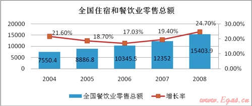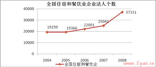 從國家統(tǒng)計局網(wǎng)站上了解到2008年我國從事住宿和餐飲的企業(yè)法人有37151個,全國餐飲業(yè)營業(yè)額已達(dá)到4824億元,每年的復(fù)合增長率達(dá)到20%。