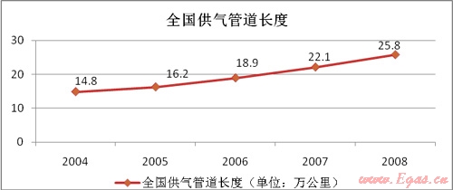 由于瓶裝氣由單獨的配套計量儀器,同時我國《城鎮(zhèn)燃?xì)饧夹g(shù)規(guī)范》規(guī)定使用管道燃?xì)獾挠脩魬?yīng)設(shè)置燃?xì)庥嬃垦b置。因此,燃?xì)夤艿赖慕ㄔO(shè)將直接影響燃?xì)獗硎袌?。根?jù)《全國城市燃?xì)夤芫W(wǎng)改造規(guī)劃(2008-2010)》,1990年至2006年,城市燃?xì)庑袠I(yè)供求管道長度從2.4萬公里增加到18.9萬公里,增加了近7倍。2002年至2006年,城市燃?xì)夤艿滥暝鲩L1.42-2.74萬公里,平均增長率超過13%,而天然氣管道的平均增長率則超過20%。