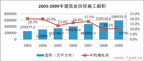 燃?xì)獗順I(yè)務(wù)與房產(chǎn)市場發(fā)展密切相關(guān)。2003年-2009年建筑房屋施工面積由259,377萬平方米增加到588,593萬平方米,年均增長14.6%。