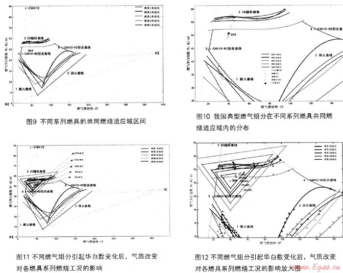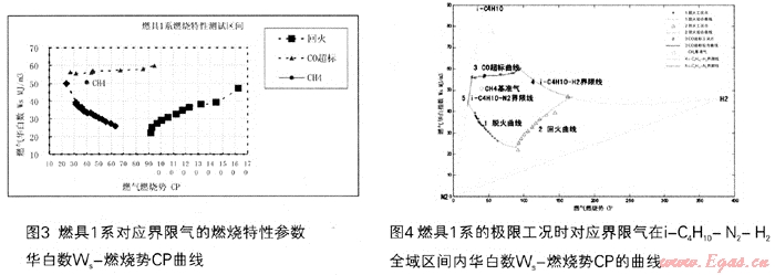 如前述圖3~8所示,以燃氣華白數(shù)顫、燃氣燃燒勢CP兩個參數(shù),建立的坐標圖形,可以得到比較平滑的脫火、回火及CO超標等極限燃燒特性曲線,并可形成比較穩(wěn)定的燃氣具適應性封閉區(qū)域。