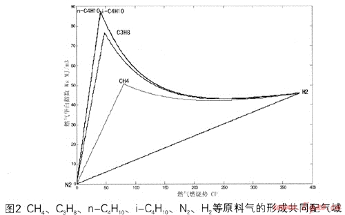 由圖2可以看出:以CH4、H2、N2三組分,C3H8、H2、N2三組分,n-C4H10、H2、N2三組分,i-C4H10、H2、N2三組分等形成的各配氣區(qū)間和共同配氣域,其邊界線并不都是直線形式。各原料氣形成的配氣邊界線中,任兩組可燃氣體形成的配氣邊界線為指數(shù)曲線形式;而N2與H2、N2與另一可燃氣體形成的配氣邊界線為直線形式。