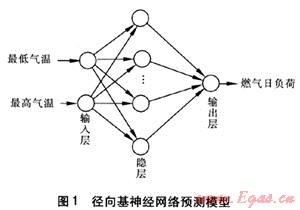 徑向基神經(jīng)網(wǎng)絡(luò)[2]是一種兩層前向型神經(jīng)網(wǎng)絡(luò),包含一個(gè)具有徑向基函數(shù)神經(jīng)元的隱層和一個(gè)具有線性神經(jīng)元的輸出層。在燃?xì)舛唐谪?fù)荷預(yù)測領(lǐng)域中,它以訓(xùn)練速度快、學(xué)習(xí)精度高的優(yōu)點(diǎn)開始逐漸嶄露頭角??紤]到燃?xì)馊肇?fù)荷受天氣狀況影響比較大,筆者以網(wǎng)絡(luò)的輸入為最低氣溫、最高氣溫,輸出為燃?xì)馊肇?fù)荷建立徑向基神經(jīng)網(wǎng)絡(luò)預(yù)測模型(見圖1)。
