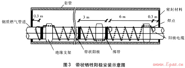 考慮到帶外防腐層的鋼質(zhì)套管的屏蔽作用,可以在套管內(nèi)設(shè)置局部陰極保護(hù)以解決套管屏蔽的問題[7]。套管內(nèi)的鋼質(zhì)燃?xì)夤艿揽刹捎脦顮奚枠O。帶狀犧牲陽極具有一定的柔性,可以緊緊纏繞在管道之外,位于套管之內(nèi),陽極電纜可以直接焊接在燃?xì)夤艿赖耐獗谏?,帶狀犧牲陽極示意圖見圖3。