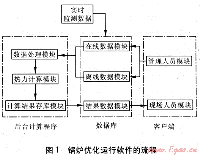 鍋爐優(yōu)化運行軟件的核心功能在于利用監(jiān)測數(shù)據(jù)通過對鍋爐運行可調(diào)參數(shù)的控制使鍋爐實現(xiàn)安全經(jīng)濟運行。鍋爐優(yōu)化運行軟件基于B/S模式(瀏覽器/服務(wù)器模式,即用戶工作界面通過IE瀏覽器來實現(xiàn))的Web網(wǎng)絡(luò)數(shù)據(jù)庫應(yīng)用系統(tǒng),可以在線顯示鍋爐受熱面的壁溫數(shù)據(jù)、污染物數(shù)據(jù)等,可指導(dǎo)現(xiàn)場人員操作。數(shù)據(jù)庫采用SQL Server2000,后臺計算程序采用Visual C++語言編寫,結(jié)合在線監(jiān)測數(shù)據(jù)進行鍋爐運行調(diào)節(jié)[3]。鍋爐優(yōu)化運行軟件的流程見圖1。