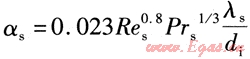 對(duì)于單相流(包括過(guò)熱氣態(tài)制冷劑、過(guò)冷液態(tài)制冷劑)管內(nèi)湍流換熱,αs采用迪圖司-貝爾特(Dittus-Boelter)關(guān)聯(lián)式表達(dá)[3]