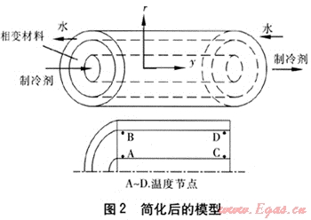 在模型簡(jiǎn)化的基礎(chǔ)上,根據(jù)圓柱體各個(gè)半徑方向上溫度場(chǎng)相同的特點(diǎn),將相變材料溫度場(chǎng)分布視為是二維的,沿徑向(圓柱半徑方向圖2中r方向)和軸向(流體流動(dòng)方向,圖2中y方向),取環(huán)形的微元體,制冷劑側(cè)的換熱模型與普通套管換熱器相同。在建立模型之前進(jìn)行如下假設(shè):制冷劑沿水平管作一維流動(dòng);兩相流在同一流動(dòng)截面上氣相和液相的壓力相等;制冷劑側(cè)能量方程中忽略動(dòng)能和勢(shì)能的影響;忽略管壁的軸向?qū)?;不考慮制冷劑重力的影響。