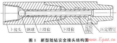 常用的安全接頭有剪釘式和反扣式兩種[3]。剪釘式安全接頭結(jié)構(gòu)簡單、剪切力可控,使用時因下管柱過程中的頓鉆、溜鉆等原因產(chǎn)生的縱向振動往往使得它在下入管柱中途斷開;若剪釘過多又會在后續(xù)的打撈作業(yè)中不起作用。因此,效果不理想。反扣式安全接頭局限性在于:當(dāng)管柱被沉砂固住,封隔器不能解封時,管柱不能轉(zhuǎn)動,安全接頭也就不能發(fā)揮作用。為了解決常規(guī)安全接頭的不可靠問題,研制新型隨鉆安全接頭是十分必要的。新型隨鉆安全接頭如圖1所示,它主要由上、下接頭、滑套、銷釘和鋼球組成,上、下接頭為反扣連結(jié)。其工作原理為:在正常鉆井作業(yè)中,它連結(jié)在鉆具的易卡部分的上端,當(dāng)遇卡鉆事故時,停鉆、停泵,拆下回壓凡爾以上工具(鉆具內(nèi)水眼需暢通)向鉆具內(nèi)投入鋼球,接上方鉆桿,開泵憋壓使鋼球入座滑套上端,由于泵壓的上升,推動中心滑套剪斷定壓定位螺釘,使中心滑套上月牙鍵脫離鍵槽,當(dāng)泵壓下降后停泵,然后正轉(zhuǎn)鉆具,使上下反扣接頭處分開,提升、取出鉆具。再進(jìn)行下一步套銑、打撈工作。在鉆井過程中,一旦發(fā)生活動鉆具無法解除的卡鉆事故,可利用該產(chǎn)品的獨特優(yōu)勢,迅速從卡點處將卡點上部鉆具倒出,降低鉆井風(fēng)險,縮短事故處理的時間,從而提高鉆井時效,節(jié)約鉆井成本。