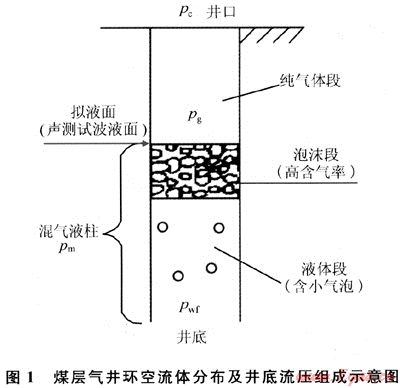 1) 煤層氣產(chǎn)出的油套環(huán)空中流體由上而下分為純氣體段、混氣液柱段,井底流壓為套壓、純氣柱壓力及混氣液柱壓力三者之和。