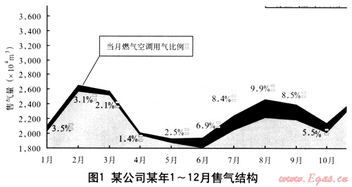 圖1為某燃氣公司某年售氣結(jié)構,從圖中看出夏季7~9月,燃氣空調(diào)用氣占公司用氣比例的平均數(shù)為9%,為調(diào)整燃氣企業(yè)售氣冬夏峰谷比貢獻近十分之一。