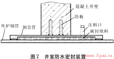 管道穿井室采用井室防水密封裝置,DN 600mm管道外管的外徑為1020mm,外管計(jì)算熱伸長(zhǎng)為185mm,如果外管與井壁采用止水環(huán)剛性連接,限制外管的位移,則外管對(duì)井室的推力將達(dá)到6200kN。采用傳統(tǒng)的柔性密封方式可靠性較差。解決這一問(wèn)題的方法有兩個(gè):①外管加裝波紋管補(bǔ)償器,但又存在波紋管補(bǔ)償器長(zhǎng)期浸于水中檢修、維護(hù)問(wèn)題。②外管與井壁連接處采用防水性能較為可靠的井室防水密封裝置,此裝置結(jié)構(gòu)與套筒補(bǔ)償器結(jié)構(gòu)相似,確保了井室整體的防水性。經(jīng)研究,在此工程中采用了井室防水密封裝置,通過(guò)專用注料器把密封填料通過(guò)注料口壓進(jìn)填料空腔,這樣在保證外管自由伸縮的同時(shí)也阻止水滲漏入井室。井室防水密封裝置見圖2。
