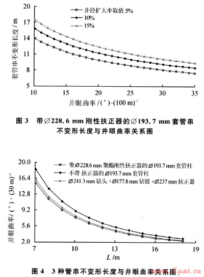 由于實(shí)測(cè)井徑不準(zhǔn)確,按井徑擴(kuò)大率5%、10%和15%對(duì)帶Ø228.6mm剛性扶正器的Ø193.7mm套管柱反算允許通過(guò)的套管串不變形長(zhǎng)度(見(jiàn)圖3),按井徑擴(kuò)大率10%對(duì)3種不同管串剛度進(jìn)行模擬,即計(jì)算不變形長(zhǎng)度與井眼曲率關(guān)系(見(jiàn)圖4)。