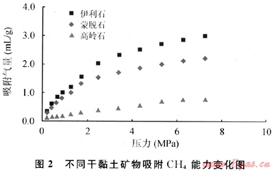 頁巖的主要黏土礦物為伊利石、蒙脫石、高嶺石和綠泥石。不同的黏土礦物對天然氣的吸附能力有著明顯的差別。在30℃溫度條件下,干黏土CH4吸附實(shí)驗(yàn)結(jié)果表明:伊利石和蒙脫石吸附CH4能力明顯高于高嶺石(圖2)[36]。