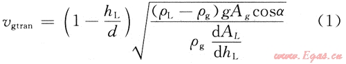 當(dāng)來(lái)流為段塞流時(shí),進(jìn)入捕集器后轉(zhuǎn)化為分層流,根據(jù)Taitel和Dukler的轉(zhuǎn)變準(zhǔn)則判斷,可以計(jì)算出一定傾角下,滿足流型轉(zhuǎn)化的管徑D,詳見公式(1):