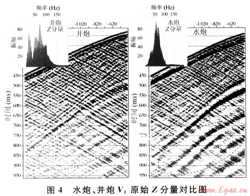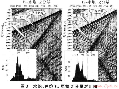 圖3為井炮、水炮激發(fā)的零井源距原始Z分量比較圖,從圖中可以看到以下特征:①兩個Z分量記錄初至都起跳干脆,時序規(guī)則,符合正常變化規(guī)律;②兩個Z分量波組特征明顯,波場信息豐富,清晰可見多套上行波和下行波;③記錄上都出現(xiàn)了井筒波、高頻干擾等;④從粉紅色箭頭內(nèi)的上行縱波可以看出,在水炮記錄上表現(xiàn)為上行縱波能量隨著偏移距的增大而逐漸減弱,到最后完全淹沒在噪聲中,而在井炮記錄上表現(xiàn)為能量隨著偏移距的增大基本不變,這說明井炮能量的穩(wěn)定性比水炮的好;⑤淺綠色橢圓內(nèi)的波組能量在水炮記錄剖面上表現(xiàn)為隨著深度的加深而逐漸減弱,到最后完全淹沒在噪聲中,而在井炮記錄剖面上表現(xiàn)為隨著深度的加深也有減弱的趨勢,但比水炮減弱的速度慢得多,在1000ms處還能清楚地看到上行縱波的能量;⑥水炮Z分量原始資料的主頻在48Hz左右,優(yōu)勢頻帶為30~80Hz,井炮Z分量原始資料的主頻在51Hz左右,優(yōu)勢頻帶為30~100Hz。由于此井水炮震點(diǎn)處的淺層堆積物少,1m以下就為致密砂巖,因此二者的主頻都較高,完全超過了地面地震資料的主頻;⑦井炮激發(fā)抗井筒波的能力比水炮激發(fā)強(qiáng)。