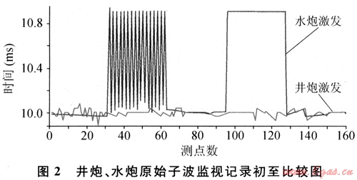 初至?xí)r間是VSP資料所包含的一個重要參數(shù),它是從VSP資料中提取地層速度信息以及VSP波場分離的前提。從理論上講,震源子波的初至?xí)r間是嚴(yán)格一致的。而實(shí)際上并非如此,炸藥震源的時間不一致現(xiàn)象更為明顯。其原因主要是炮井位置的改變、激發(fā)深度的變化、井中激發(fā)環(huán)境的變化等。對本次試驗(yàn)的水炮、井炮激發(fā)來說也不例外。每炮間初至的變化幅度越小則說明震源的一致性越好。圖2為水炮、井炮子波監(jiān)視記錄的初至比較圖。從圖中可以看出,井炮變化幅度在0.2ms左右,而水炮的變化幅度在1ms左右,這說明井炮的初至一致性比水炮的一致性好。