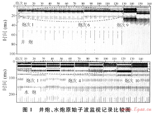 一般情況下,使用多級檢波器采集VSP數(shù)據(jù)時,“井炮”激發(fā)的能量比“水炮”強(qiáng)、一致性比“水炮”好,主頻比“水炮”高、抗低頻的能力較“水炮”強(qiáng),變“水炮”為“井炮”是提高原始資料品質(zhì)的一種有效途徑。