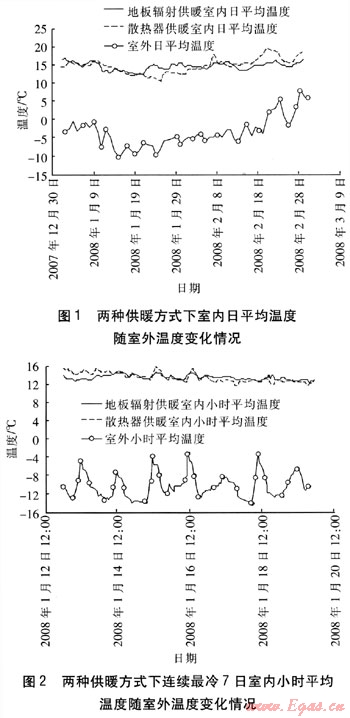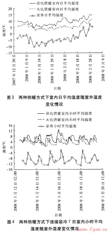 在建筑結(jié)構(gòu)、熱工性能、供暖面積、生活習(xí)慣相近的條件下,對(duì)分別采用散熱器、地板輻射供暖、散熱器+吊炕、散熱器+火炕供暖方式的室內(nèi)小時(shí)平均溫度進(jìn)行實(shí)測。在連續(xù)最冷7日內(nèi),采用散熱器供暖、地板輻射供暖的農(nóng)村居民室內(nèi)小時(shí)平均溫度較高,受室外溫度的影響較小,且地板輻射供暖熱穩(wěn)定性最好。采用散熱器+吊炕供暖的室內(nèi)溫度比采用散熱器+火炕供暖的室內(nèi)小時(shí)平均溫度高,但采用這兩種供暖方式的室內(nèi)小時(shí)平均溫度波動(dòng)性較大。