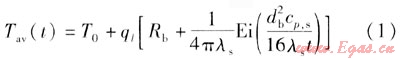地埋管換熱器的傳熱模型主要有線熱源模型、柱熱源模型。線熱源模型是基于1948年Ingersoll和Plass等人發(fā)展的Kelvin線熱源理論[8]。工程上常見(jiàn)的地埋管換熱器的直徑一般為26~36mm,鉆孔深度為40~200m,與鉆孔深度相比,地埋管的直徑很小。在地埋管換熱器工作時(shí),相當(dāng)于在半無(wú)限大介質(zhì)中,鉆孔中心的一根線熱源與周?chē)鷰r土進(jìn)行熱交換。另外,假設(shè)沿地埋管長(zhǎng)度方向傳熱量忽略不計(jì),周?chē)鷰r土均勻且線熱源與巖土的傳熱量恒定。由于該方法不受具體換熱器形式的限制,計(jì)算較簡(jiǎn)單,且能滿足一般工程中土壤源熱泵系統(tǒng)設(shè)計(jì)計(jì)算的要求,具有較廣泛的實(shí)用性。根據(jù)假設(shè),可以得到地埋管內(nèi)流體平均溫度與鉆孔周?chē)鷰r土初始平均溫度及其他參數(shù)之間的關(guān)系式[9]: