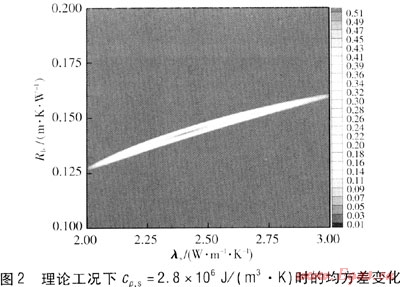 為了減少計(jì)算量,本文控制待求熱物性參數(shù)在一定范圍內(nèi)變化,得到相應(yīng)均方差,并采用Tecplot繪圖,在圖中即可得到均方差最小區(qū)域所對(duì)應(yīng)的待求參數(shù)值。