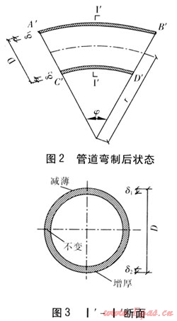 天然氣高壓管道進行彎制時,管道彎曲段受力變形,彎制前狀態(tài)見圖1,彎制后狀態(tài)見圖2,彎曲段Ⅰ′-Ⅰ′斷面見圖3。管道在彎制過程中,內(nèi)側(cè)管壁受壓力,由于擠壓作用管壁由直線形(如CD段)變成圓弧形(如C′D′段),管壁由于壓縮變短而增厚;外側(cè)管壁受拉力,由于拉伸作用管壁由直線形(如AB段)變成圓弧形(如A′B′段),管壁由于拉伸變長而減薄。管壁減薄會使強度降低,為保證管壁減薄后仍有足夠強度,要求管壁有一定厚度,在彎曲段管壁減薄應均勻。