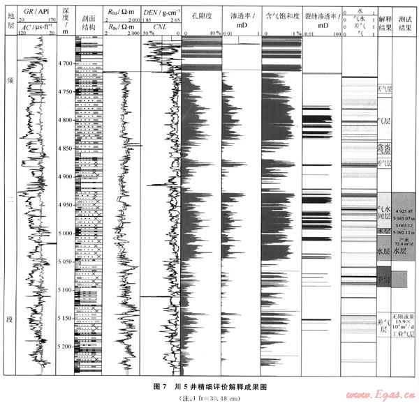 將上述方法得到的定性、定量結(jié)果進(jìn)行綜合分析評(píng)價(jià),并結(jié)合測(cè)試結(jié)果,可對(duì)儲(chǔ)層進(jìn)行有效性識(shí)別。圖7是川5井綜合評(píng)價(jià)圖。該井顯示須二段上部?jī)?chǔ)層物性、天然氣、裂縫匹配關(guān)系較好,而含水夾層對(duì)應(yīng)裂縫不發(fā)育段,故解釋該層為氣層,原始狀態(tài)不產(chǎn)水;中上部?jī)?chǔ)層段有含水夾層且對(duì)應(yīng)裂縫發(fā)育,綜合解釋該層為含水氣層;中下部含氣性差,以含水夾層為主,裂縫發(fā)育,綜合解釋該層為含氣水層;下部以含水層為主,綜合解釋為含水層;底部砂層有一定的裂縫發(fā)育,流體局部含氣,綜合儲(chǔ)層參數(shù)綜合解釋為差氣層。測(cè)試時(shí)對(duì)該井進(jìn)行了兩次射孔測(cè)試,第一次對(duì)5157~5180m進(jìn)行測(cè)試,獲天然氣產(chǎn)量8.58×104m3/d;第二次對(duì)4925~5045m和5063~5092m進(jìn)行測(cè)試,結(jié)果產(chǎn)水量72.4m3/d,后經(jīng)生產(chǎn)測(cè)井證實(shí)主產(chǎn)水層為5033~5044m和5073~5091.7m。該井的精細(xì)評(píng)價(jià)結(jié)果得到了很好的地質(zhì)印證[6~7]。