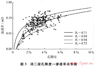眾所周知,滲透率的大小主要取決于孔隙度的大小和孔隙的幾何形狀,通過(guò)對(duì)須二段大量的鑄體薄片觀察分類后,建立了與微裂縫發(fā)育程度有關(guān)的孔隙度與平均滲透率之間的關(guān)系(圖3),其中滲透性最好的是由黑色曲線代表,綠色曲線表示最為致密,橙紅色曲線表示在顯微鏡下可見孔隙連通性較差,未見或有極少微裂縫,喉道發(fā)育差;藍(lán)色曲線則代表有少許喉道或微裂縫連通,將測(cè)井曲線與之進(jìn)行綜合標(biāo)定后,可計(jì)算得到不同孔隙結(jié)構(gòu)及裂縫發(fā)育程度下的地層滲透率。