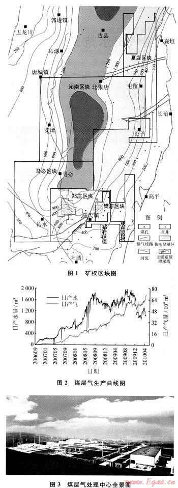 以煤層氣處理中心為標(biāo)志的配套工程建成投產(chǎn)(圖3),從根本上解決了制約煤層氣外輸和利用的瓶頸問題,依托“西氣東輸”干網(wǎng)可以順利實(shí)現(xiàn)煤層氣上輸和下載,將為“氣化山西”發(fā)揮積極作用。自2009年9月10日處理中心向“西氣東輸”干網(wǎng)供氣,目前累計(jì)完成商品量在1.2×108m3,日外輸氣量在100×104m3以上。