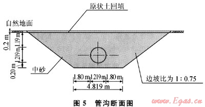 西氣東輸二線輸氣管道罐罐嶺地震斷裂帶施工段采用寬管溝敷設方式,對于地震斷裂帶兩側各30m范圍內,以斷裂帶為中心,逆氣流方向一側溝底寬4.819m,管溝挖深4.609m,管溝放坡為1:0.75,管溝底部2.0m深度部分用中砂墊層。順氣流方向一側溝底寬4.819 m,管溝挖深2.809m,管溝放坡為1:0.75,管溝底部0.2m深度部分用中砂墊層,如圖1、2所示。