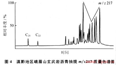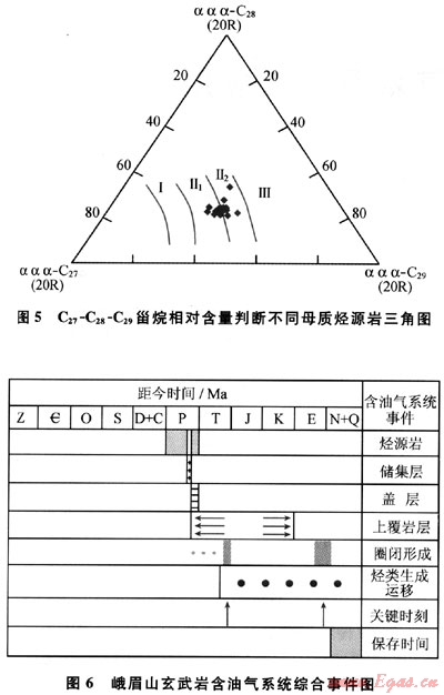 另據(jù)玄武巖瀝青的m/z217質量色譜圖(圖4),規(guī)則甾烷呈近“V”字形,C27占優(yōu)勢,反映水生生物輸入有機質較多,利用C27-C28-C29甾烷相對含量判斷烴源巖母質類型(圖5),表明除水生生物外,還有部分腐殖型有機質的輸入;由于上覆的沙灣組在漢王場-青神-犍為-珙縣以東地區(qū),已相變?yōu)楹谏搸r夾薄層石灰?guī)r,有時可見薄層碳質頁巖和煤層[3],故推測氣源可能有上二疊統(tǒng)煤系地層的貢獻。