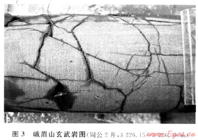 研究區(qū)玄武巖裂縫以成巖裂縫和構造裂縫為主(圖3)。成巖裂縫包括因內外散熱不均,冷縮作用形成的一些柱狀節(jié)理,收縮縫、晶間縫;構造裂縫是構造應力的產(chǎn)物。按傾角分為水平縫、斜交縫、垂直縫,據(jù)巖心統(tǒng)計,三者數(shù)量比例大致為1:2:2,其中垂直縫和斜交縫較寬(最寬可達2cm),水平縫較窄大多為全充填縫。巖石裂縫發(fā)育程度不均,一般(2~3)條/m、最多達12條/m;普遍發(fā)育寬0.05~2.0mm的微裂縫,周公2井薄片見遇率達55%,但多被充填或半充填并常伴溶蝕現(xiàn)象。綜上所述,峨眉山玄武巖是由原生氣孔、溶蝕孔洞和裂縫構成的孔洞-裂縫型儲層。