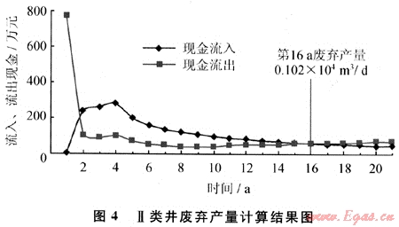 氣井20a評(píng)價(jià)期,在目前技術(shù)經(jīng)濟(jì)條件下,生產(chǎn)到第16a時(shí),單井產(chǎn)量0.102×104m3/d,當(dāng)年現(xiàn)金流出70.19萬元,總銷售收入70.18萬元(圖4)。為此,Ⅱ類井的廢棄產(chǎn)量為0.102×104m3/d,經(jīng)濟(jì)生產(chǎn)期17a。