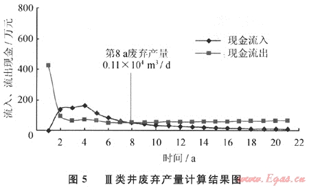 氣井20a評(píng)價(jià)期,在目前技術(shù)經(jīng)濟(jì)條件下,氣井生產(chǎn)到第8a時(shí),單井產(chǎn)量0.11×104m3/d,當(dāng)年現(xiàn)金流出60.86萬元,當(dāng)年總銷售收入60.74萬元(圖5)。為此,Ⅲ類井的廢棄產(chǎn)量為0.11×104m3/d,經(jīng)濟(jì)生產(chǎn)期8a。