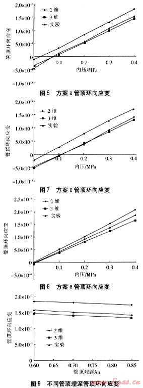 圖6~8分別給出了實(shí)驗(yàn)方案a、c、e在不同燃?xì)鈮毫r(shí),埋地燃?xì)夤艿拦茼敪h(huán)向應(yīng)變與有限元模擬結(jié)果的對(duì)比。圖6~9中給出的實(shí)驗(yàn)與計(jì)算結(jié)果均為實(shí)驗(yàn)管段中間斷面的數(shù)據(jù)。有限元模擬采用了2維模型與3維模型兩種方法。