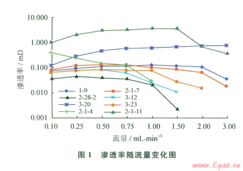 速敏性評價(jià)實(shí)驗(yàn)的目的在于了解儲層滲透率的變化與儲層中流體流動(dòng)速度的關(guān)系,評價(jià)敏感程度及臨界流速,為油氣井合理產(chǎn)量和注入速度提供依據(jù)。對8塊巖樣的實(shí)驗(yàn)分析表明:珍珠沖組儲層滲透率與流量的關(guān)系多樣化,有6塊巖樣滲透率在低流速段隨流速增大而增大,當(dāng)流速增大到一定程度時(shí),滲透率急劇下降,產(chǎn)生速敏性;1塊巖樣在最小流量下就產(chǎn)生了速敏效應(yīng);l塊巖樣隨著流量的增大,滲透率持續(xù)增高(圖1)。巖樣滲透率損害率為67.2%~94.1%,屬于強(qiáng)速敏的占75%;臨界流量主要在0.5~2.0 mL/min之間,折算的臨界流速為1.79~6.