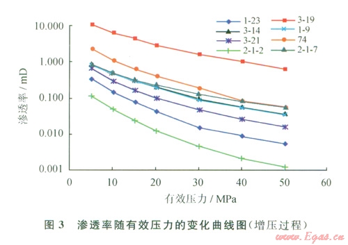 實(shí)驗(yàn)分別進(jìn)行了增壓過程和降壓過程的測試,增壓過程凈圍壓設(shè)置依次為5 MPa、10 MPa、15 MPa、20MPa、30 MPa、40 MPa、50 MPa,每一個(gè)圍壓保持30min后,測定巖心氣體滲透率;到最大壓力50 MPa以后,開始進(jìn)行降壓過程測試,緩慢減小圍壓,使凈圍壓依次降為40 MPa、30 MPa、20 MPa、15 MPa、10 MPa、5 MPa,每一個(gè)圍壓點(diǎn)保持60 min后,測定設(shè)定凈圍壓下的巖心滲透率。