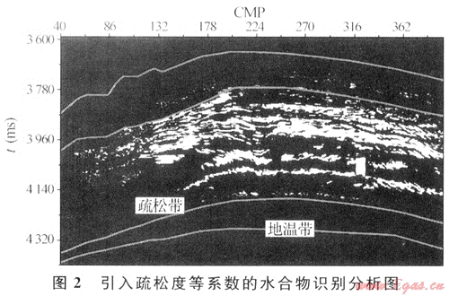 采用疊前AVO反演求得縱橫波速度信息[7]。通常海洋中淺層地層的地震縱波速度為1.6~1.8km/s,在含天然氣水合物層中,地震波速度將提高至1.85~2.5km/s,在速度剖面上,水合物層的層速度變化趨勢呈典型的三段式,即上下低,中間高。同時(shí)結(jié)合疏松系數(shù)、地?zé)崽荻鹊葏?shù),可以提高水合物識別的可信度(圖2)。